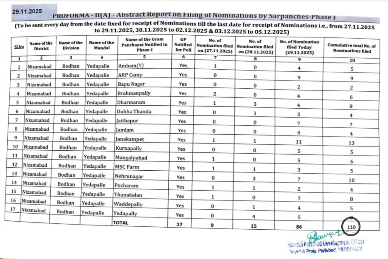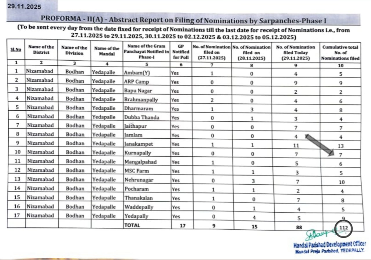 శనివారం రాత్రి 11 గంటల ప్రాంతంలో మొత్తం 110 సర్పంచ్ అభ్యర్థుల నామినేషన్లు నమోదయ్యాయి అని, మండల ఎన్నికల అధికారి అధికారికంగా ప్రకటించగా, మరుసటి రోజు పత్రాల పరిశీలన అనంతరం విడుదల చేసిన ప్రకటనలో సంఖ్య 112కు పెరగడం ప్రజల్లో అనుమానాలు రేకెత్తించింది.