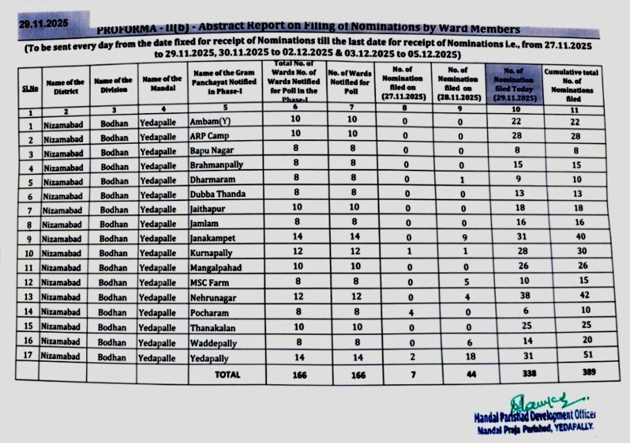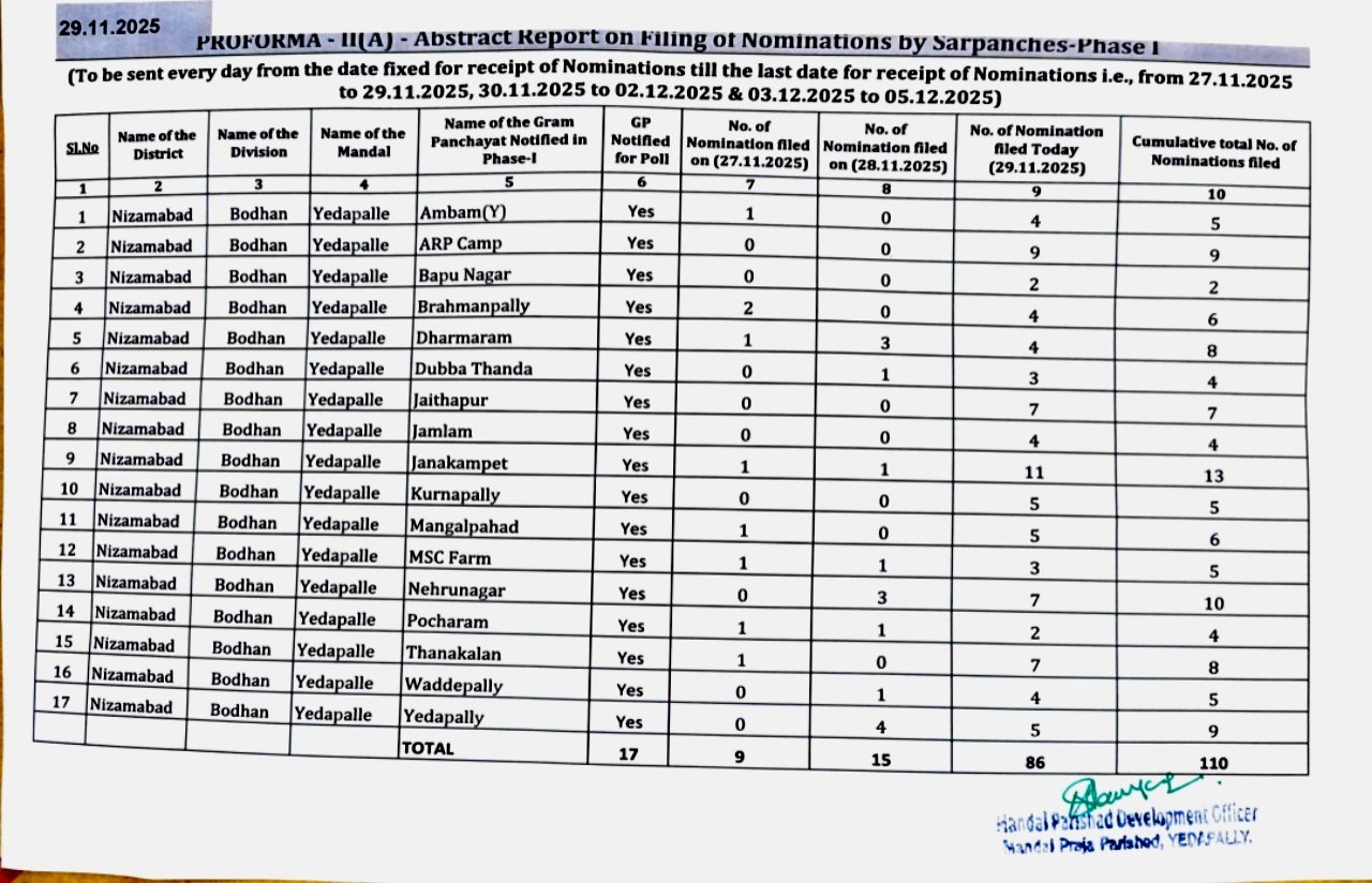 నిజామాబాద్ జిల్లా ఎడపల్లి మండలం పంచాయతీ ఎన్నికలతో మరోసారి రాజకీయ చర్చలకు కేంద్రంగా మారింది. తెలంగాణ ప్రభుత్వం సర్పంచ్ ఎన్నికల నోటిఫికేషన్ విడుదల చేసిన వెంటనే మండల రాజకీయం వేడెక్కింది. మొదటి విడతలో ఈ మండలం ఉండటంతో, నామినేషన్ల స్వీకరణ గురువారం ప్రారంభమై శనివారంతో ముగిసింది. మొదట రెండు రోజులు నెమ్మదిగా ప్రశాంతంగా సాగిన ఎన్నికల ప్రక్రియ, చివరి రోజు ఎన్నికల కేంద్రాల వద్ద అభ్యర్థుల భారీ రద్దీతో ఉత్కంఠభరితంగా మారింది.